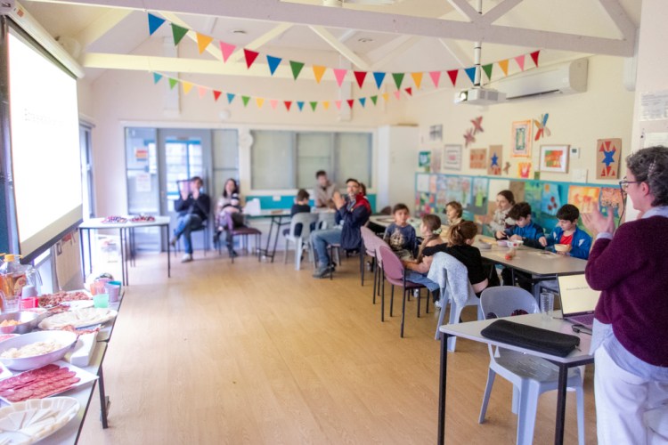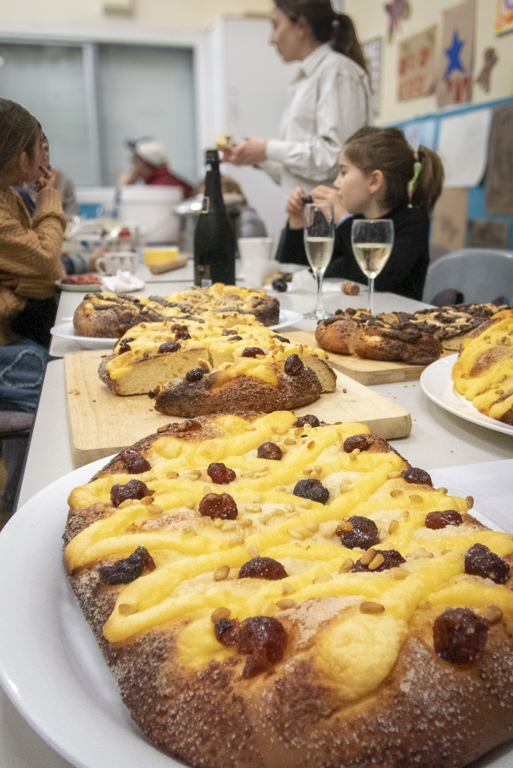 A mesura que la sala s’anava omplint, els més menuts s’han assegut encuriosits per escoltar la història de la revetlla. La Nicole els ha explicat amb passió els orígens d’aquesta festivitat tan esperada i com la celebrem als Països Catalans. Amb l’ajuda del projector hem revifat moments màgics d’altres revetlles i il·lustrat els balls tradicionals, exibicions amb els focs d’artifici per enlluernar les nits amb combinacions de colors màgics, i les nostres coques ben dolces amb fruita i gustossos pinyons ben torradets!